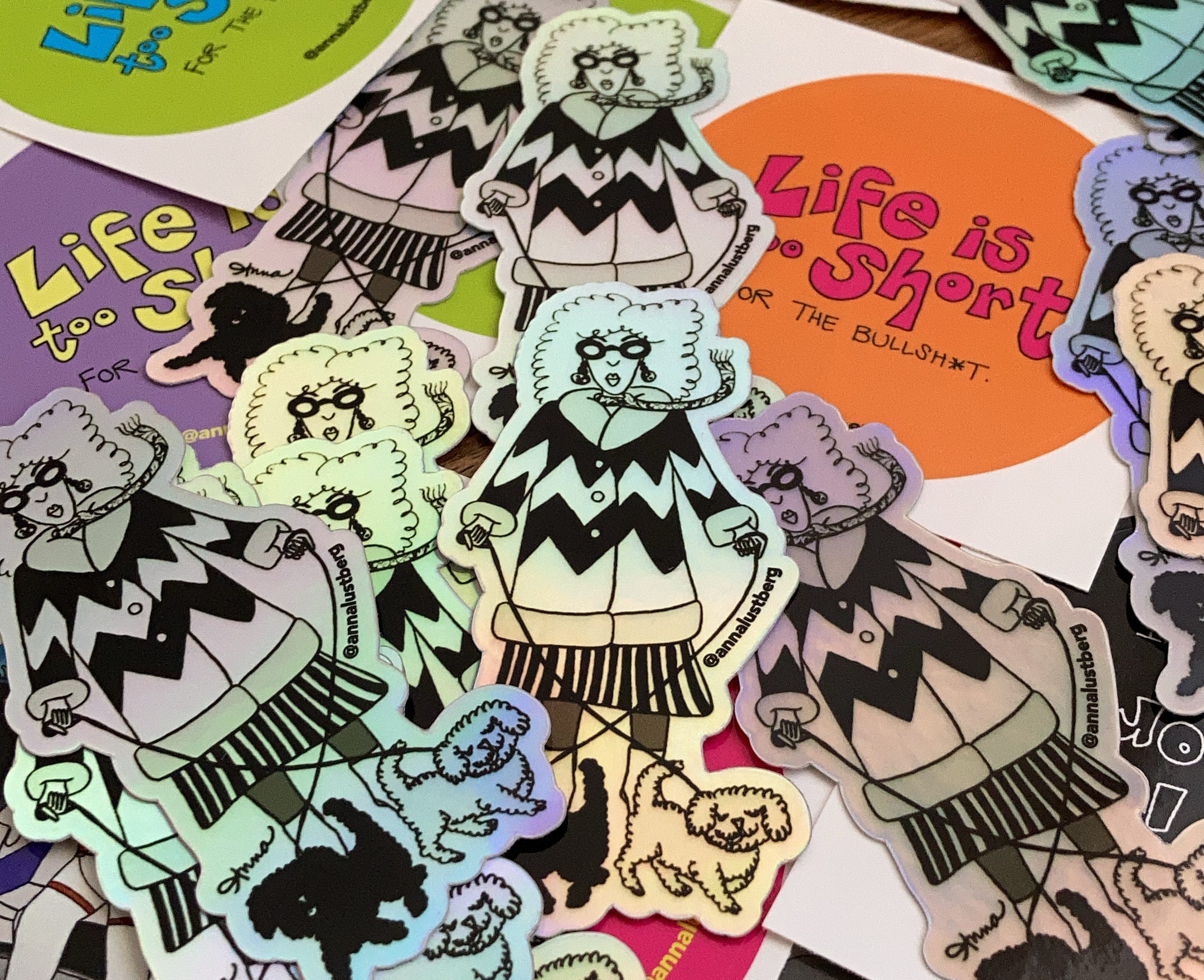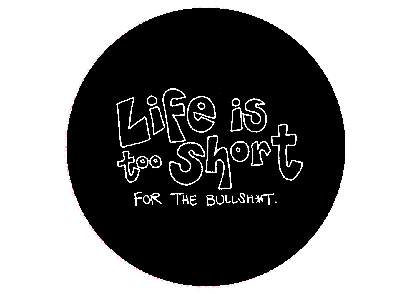 It might have morphed from a page in an old sketchbook, where I’d scrawled life is too short (in large bubble letters) for the bullsh*t (a smaller line in all caps right below). This later became a design on a round sticker that my 20-something homies and I stuck up around bathroom walls in bars around the city.