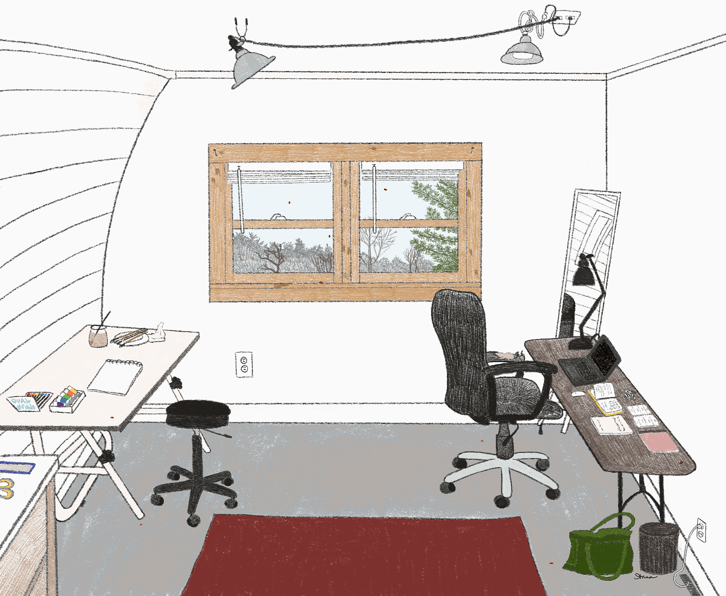 Late-night online searching for some sort of escape led to my discovery of Millay Arts, which offers a quiet, peaceful winter retreat where artists can apply for time to create and reflect. While juggling my full-time job at the gallery, other freelance obligations, and recent health issues, I’d been frustrated with finding less and less time to devote to my illustrations. Getting into a headspace where I could draw and write freely had begun to feel harder to reach. Email threads and to-do lists followed me everywhere. If I didn’t get this week to myself, it meant I was prioritizing everyone and everything over me.